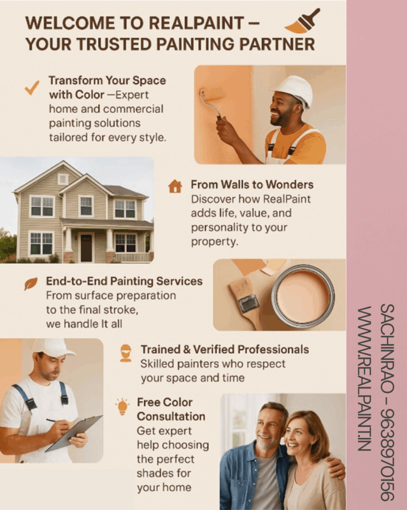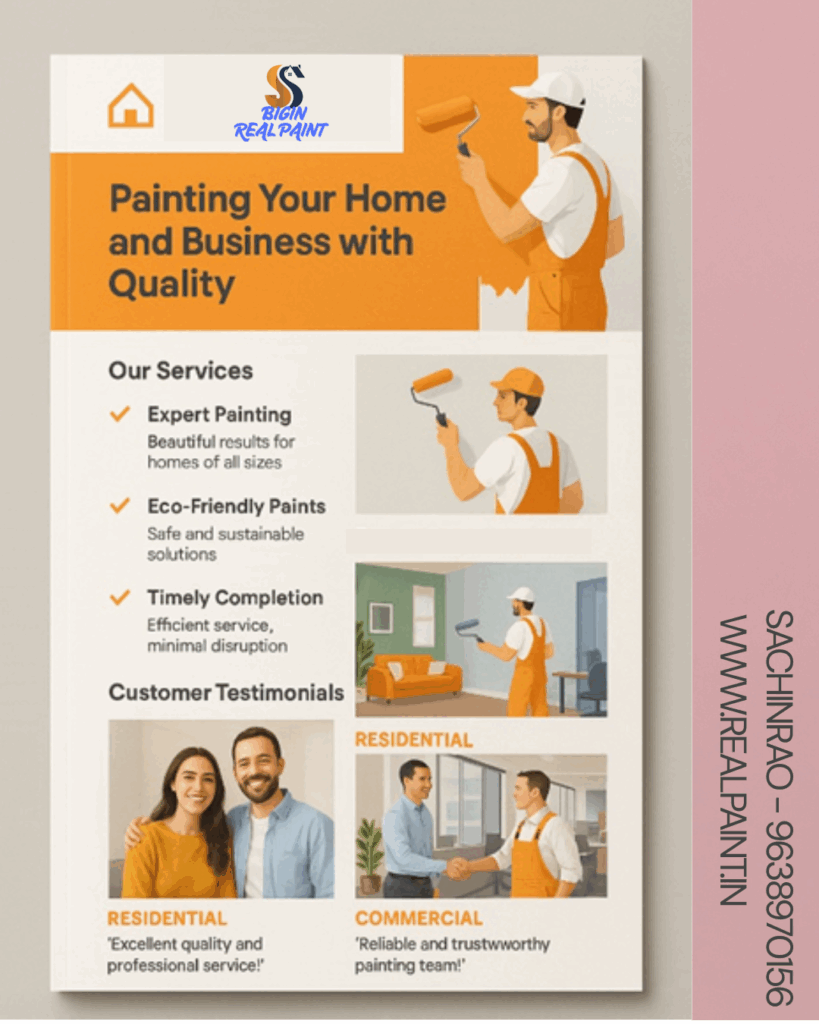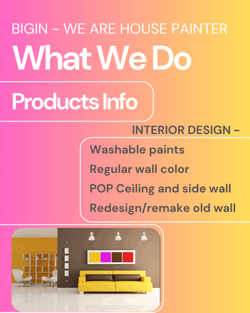 BIGIN makes home painting effortless, affordable, and beautiful. We handle everything — Prep to Finish — so you can sit back and enjoy the COLOR AND STRUCTURE transformation. SITE VISIT ON ONE CALL: +91 – 9638970156 CLICK ON THIS GREEN BUTTON BOOK FREE CONSULTATION Facebook Instagram Fill the form and Get free consultation! Your name Your email Mobile Number BOOK FREE CONSULTATIONAttractive texture on the wallRemake wall with STAIN PROOF FURNITURETotal Home furniture with ROYALE PAINTChildren room area with paint / furnitureGift your loved one with attractive room repaintMarriage anniversary special gift with master room remakePOP – all types of ceilingsExterior paint with textureWater proofing paint in your budget You may Download Ebook for your referance.